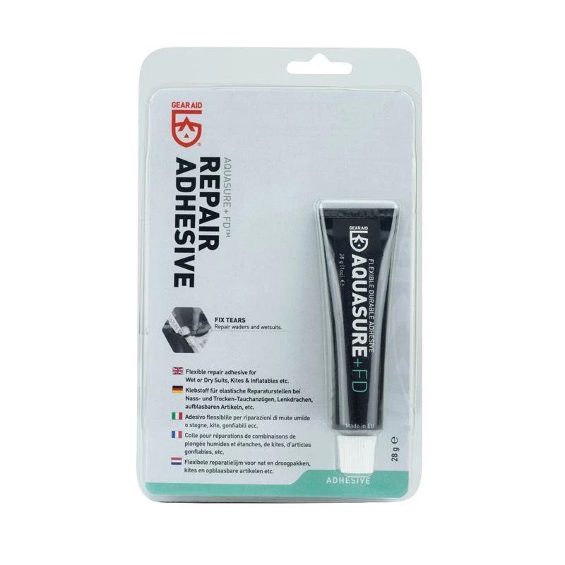 GearAid AquaSure +FD er en effektiv lim til reparation og tætning af utætte sømme på gummi, neopren og andre vandtætte materialer.